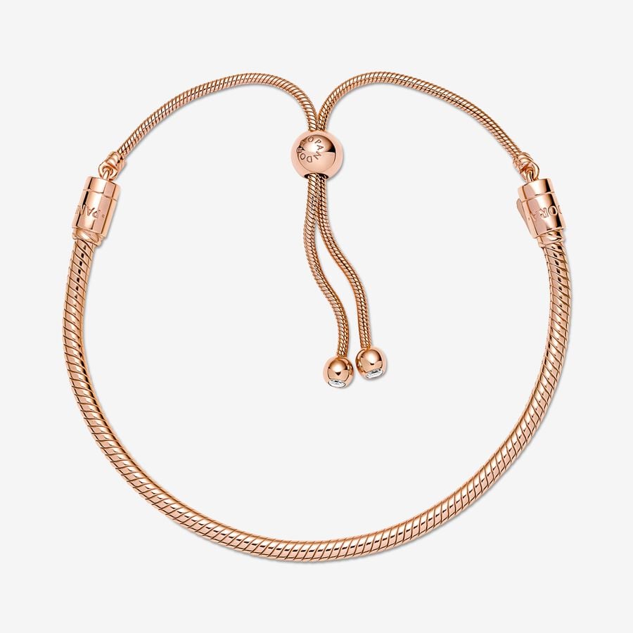 This stunning Pandora Moments Snake Chain Slider Bracelet is a sophisticated spin on the classic friendship bracelet. Hand-finished and 14k rose gold-plated, it features one fixed and one movable end cap — both set with shimmering stones. An innovative sliding clasp makes it easy to adjust it to your size. The perfect present for friends and loved ones, it can be styled by lifting the movable end cap and adding your favorite Pandora charms. The lobster clasp and jump ring are made from sterling silver plated with 14k rose gold.