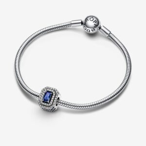 Bring a sophisticated touch of color to your jewelry with the Blue Sparkling Leveled Rectangular Charm. Crafted from sterling silver, each side of the charm features a princess blue, rectangular, radiant-cut, man-made crystal at the center, outlined by two rows of clear cubic zirconia pavé. A cut-out heart pattern features on the sides. Style this piece on your go-to Pandora Moments bracelet to make a sparkling statement.