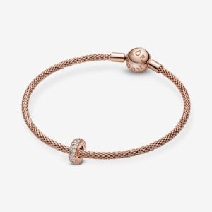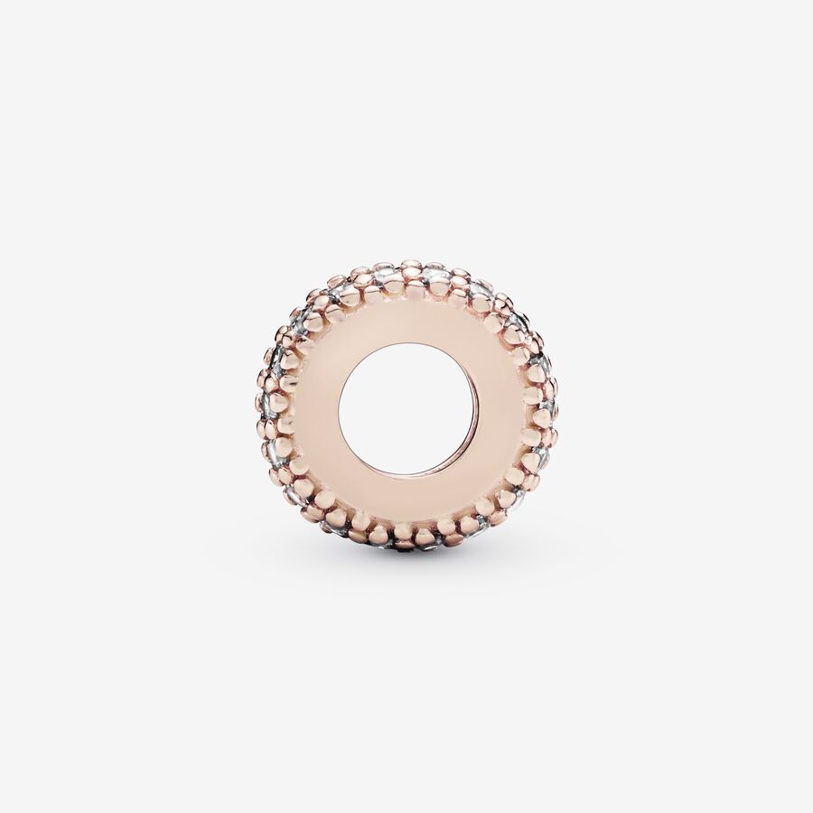 Add instant sparkle to a favorite bracelet with this hand-finished Pandora Clear Sparkle Spacer Charm. Carefully hand-finished with eye-catching cubic zirconia details, the 14k rose gold-plated piece sparkles with your every move. Thread it on your favorite Pandora Moments bracelet, string it on a necklace as a pendant, or attach it to a hoop earring to create a look that’s uniquely you.