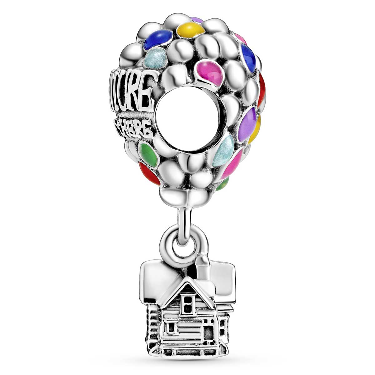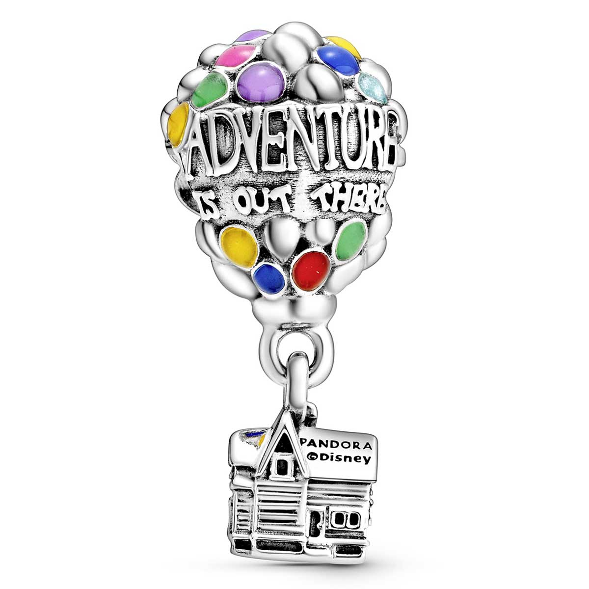 Get ready to go on a journey of a lifetime with Disney’s Up House & Balloons Charm. The colorful charm features a bundle of hand-applied enamel princess blue, light blue, mandarin orange, pale cerise, vibrant green, purple and magenta balloons carrying the sterling silver dangle house that Carl uses to go on his fantastic journey. Raised letters amongst the many colorful balloons add an inspirational touch with the statement “Adventure is out there”.
