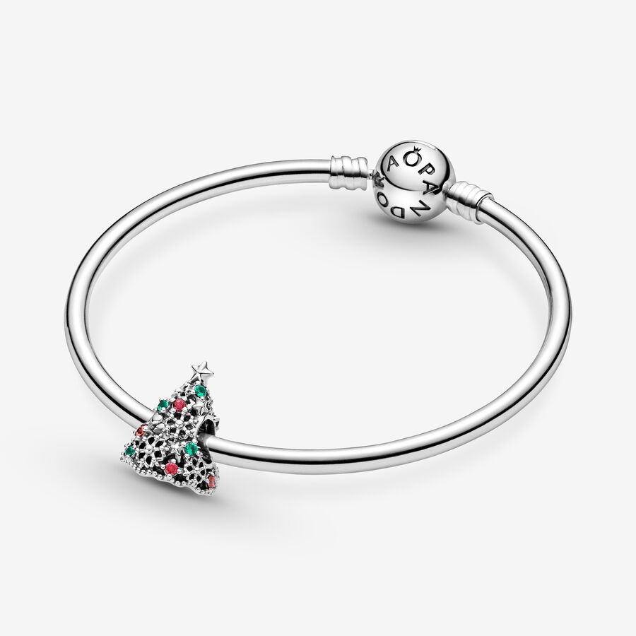 Get set for the holidays with the Glitter Christmas Tree Charm. Hand-finished in sterling silver, celebrate the magic of the festive season with this sparkling charm. This openwork Christmas tree includes stars, hearts and snowflakes alongside red and green stones to represent baubles. A star on top and cut-out snowflake on the bottom complete this highly detailed piece. Style this charm with other glittering designs to express how much you love the most wonderful time of the year.