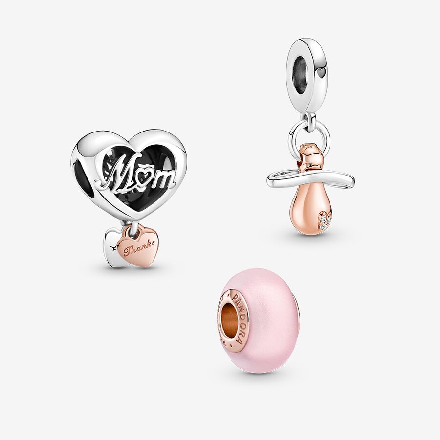 It’s a girl! Express the joy that only a precious baby girl can bring by gifting this charm trio to your favorite new mom. It comes with the Thank You Mom Heart Charm with a sterling silver, heart-shaped design that says “MOM” in script on one side and “Thank you for being there” on the other, plus two tiny sterling silver and 14k rose gold plated heart-shaped dangles reading “Thanks” and “Love” on both sides. For added cuteness, there’s the Baby Pacifier Dangle Charm, a 3D, two-tone sterling silver and 14k rose gold-plated pacifier. It’s designed with the engraving “MADE WITH LOVE” on the shield with small cut-out hearts adorned with cubic zirconia on both the mouthpiece and shield. And completing the set is the Matte Pink Murano Glass Charm featuring frosted Murano glass with a matte surface.