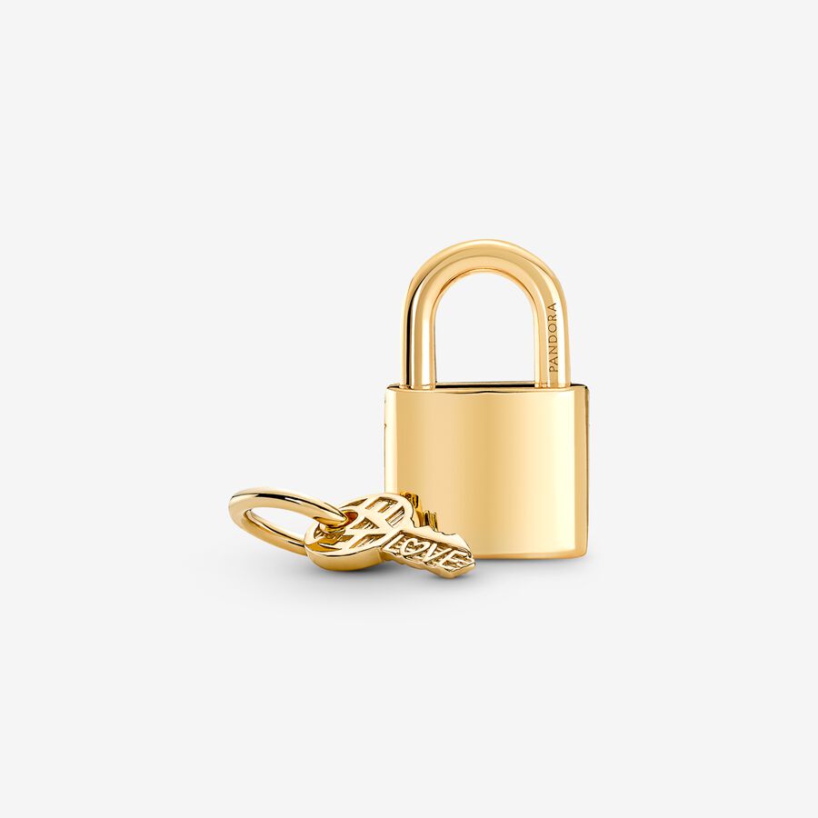 Cherish the special connection you share with loved ones with this Padlock and Key Dangle Charm. Featuring two parts, the key is also a charm in itself. Place it next to the padlock and style the two together on your jewelry, or gift it to a loved one, so only they have the power to unlock your padlock. Inspired by the locks placed on bridges by lovers all around the world, this 14k gold-plated Padlock and Key Charm is the perfect way to capture your love. Compatible with necklaces and bracelets, wear yours around your neck as a pendant or as a charm on your bracelet and let the one you love carry the key to your padlock – and your heart. Please note: the key should not be worn inside the padlock.