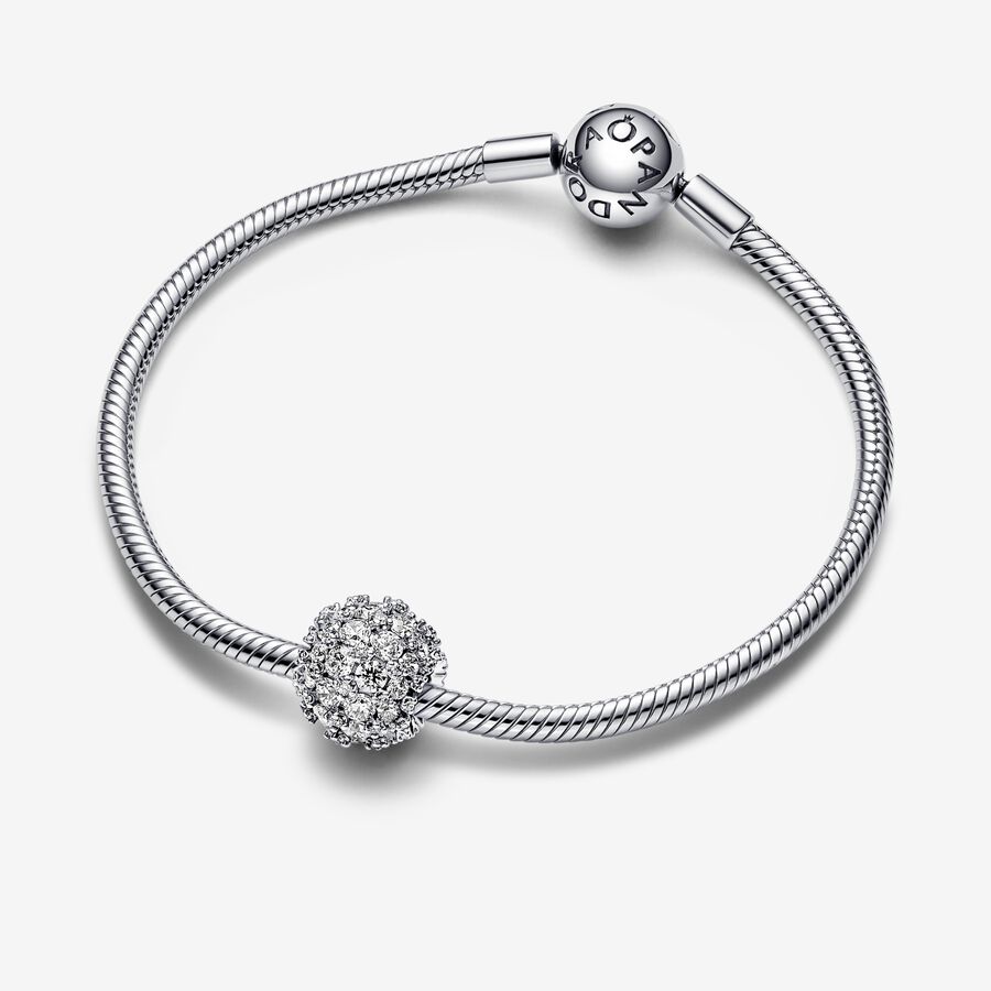 Add a touch of timeless sparkle to your look with the elegant and symbolic Sparkling Pavé Round Charm. This spherical sterling silver charm is set with a total of 88 clear cubic zirconia stones in different sizes, creating a voluminous geometric effect. 88 is a powerful number that represents progress, success and good fortune. It also resembles a double infinity symbol, representing the unlimited possibilities the future holds. Add it to your favorite jewelry styling or gift it to a loved one as a symbol of good things ahead.