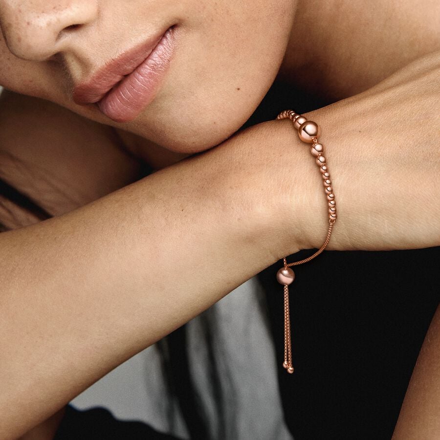 The last word in elegance, the String of Beads Slider Bracelet is minimalist, chic and perfect for stacking. Hand-finished in 14k rose gold-plated unique metal blend, the design is a sleek addition to your arm and an ideal piece to compliment your other Pandora bracelets. The rose-hued spheres, decreasing in size from the largest at the center, symbolize continuity, making it a perfect gifting piece to show that your love will always be there.
