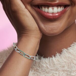 Remix radiance into your link chains with this ME Styling Pavé Double Link. Made up of two interlocking links set with two rows of round brilliant-cut green crystals, each link is hand-finished in Silver plated. Style yours between connectors on your ME link chain bracelets or necklaces, or connect to your hoops for a fresh statement. Styling tip: the length of a double link matches the length of two regular links, four small interlocking links or one styling link – for easy personalisation. Please note this item is only compatible with ME jewelry and will not fit our other collections.Discover how to mix and re-mix your ME look here.