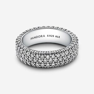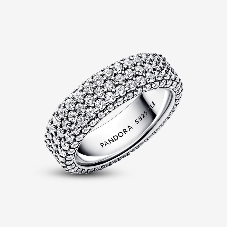 Maximize your sparkle with our hand-finished Timeless Pavé Triple-row Ring. Crafted from sterling silver, this stand-out ring features three rows of clear cubic zirconia around the center and one row facing outwards around each side, creating a slightly rounded square profile that sparkles from every angle. Wear it on its own or stacked with other Timeless Pavé rings to create as bold of a look as you want.StoneCubic ZirconiaColourClearProduct TypeRingsItem192634C01MetalSterling silverMaterialNo Other MaterialDimensionsDepth:2.61 mmHeight:6.12 mm